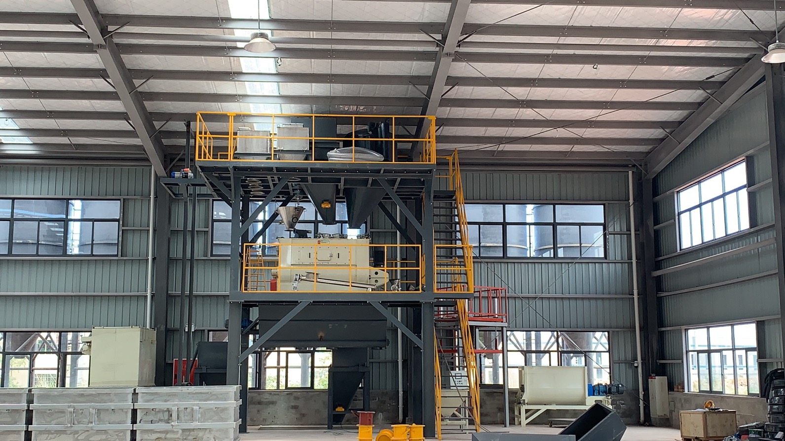 該設(shè)備主要由計量斗、小料計量、待混倉、斗式皮帶提升機(jī)、雙軸臥式攪拌機(jī)、?;⒅檩斔脱b置、成品料倉、閥口包裝機(jī)、電控操作臺、除塵器、自動配料系統(tǒng)(選配)、自動碼垛系統(tǒng)(選配)和雙層鋼構(gòu)平臺組成。