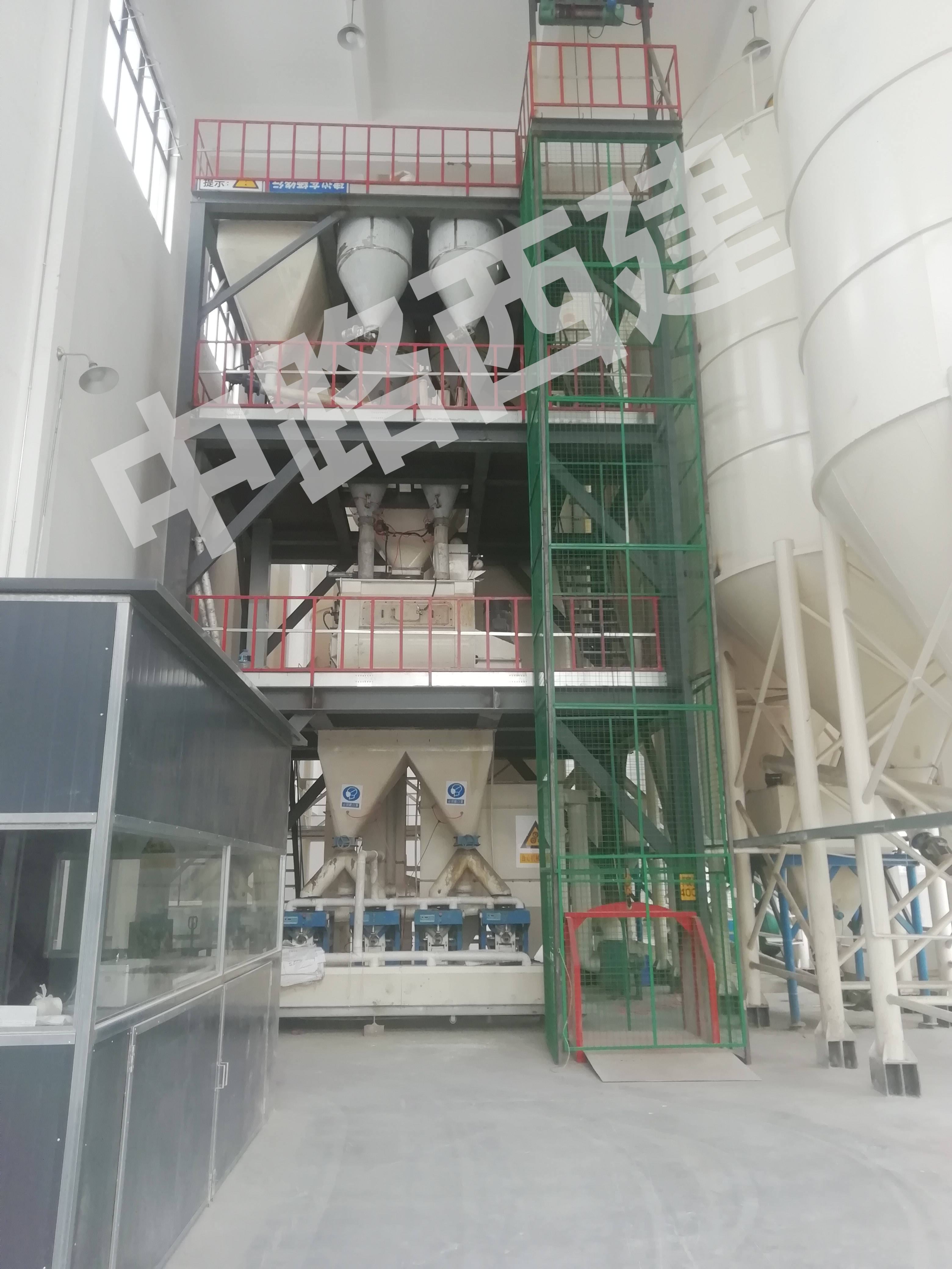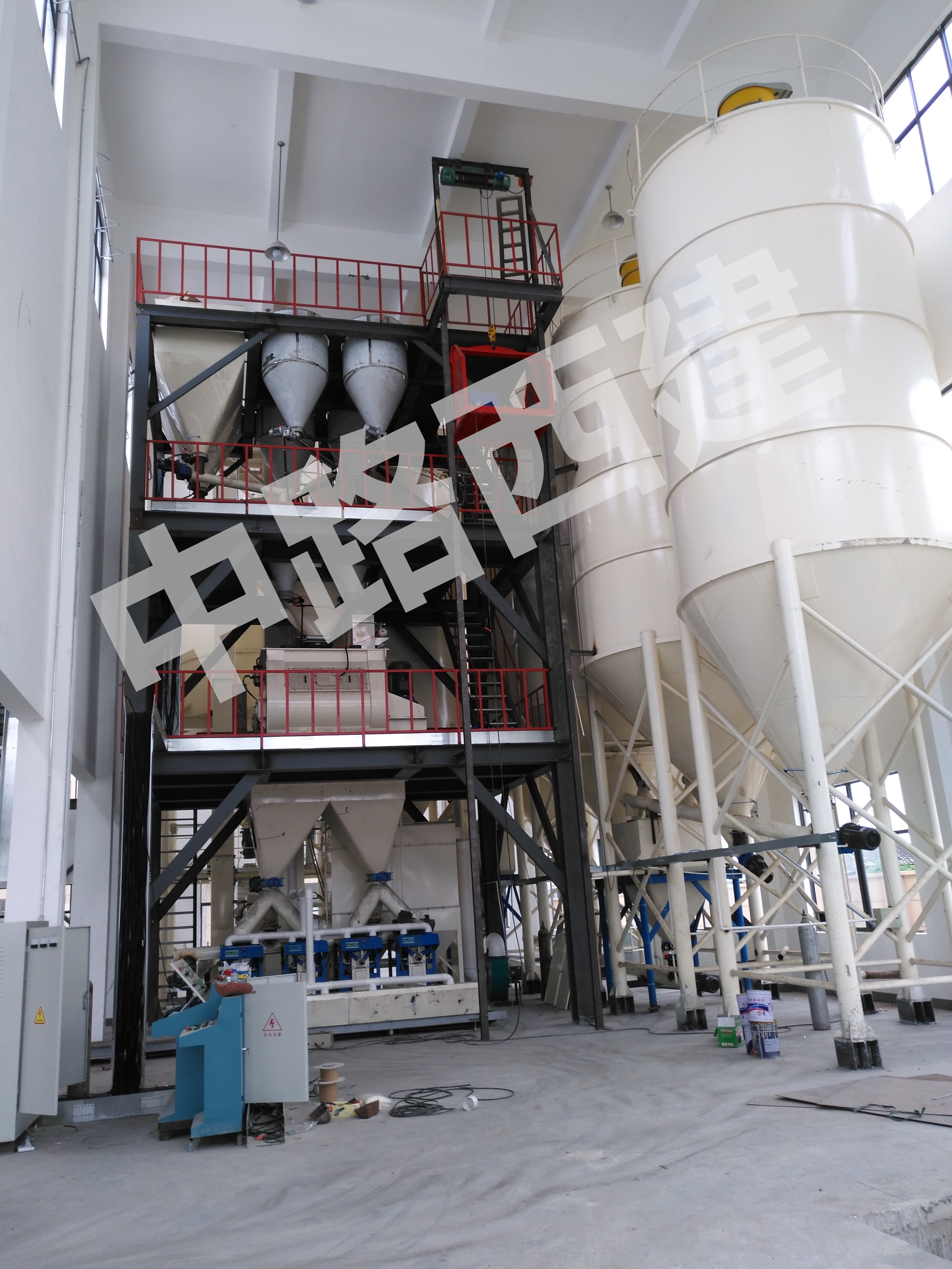 計(jì)量斗、小料計(jì)量、待混合、斗式皮帶提升機(jī)、臥式攪拌機(jī)、?;⒅檩斔脱b置、成品料倉(cāng)、閥口袋包裝機(jī)、電控操作臺(tái)、除塵器、自動(dòng)配料系統(tǒng)(選配)、自動(dòng)碼垛系統(tǒng)(選配)、雙層鋼結(jié)構(gòu)平臺(tái)。
